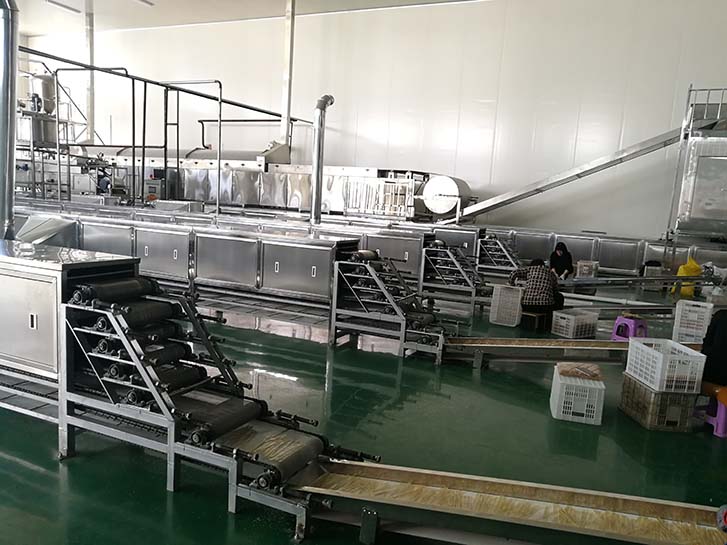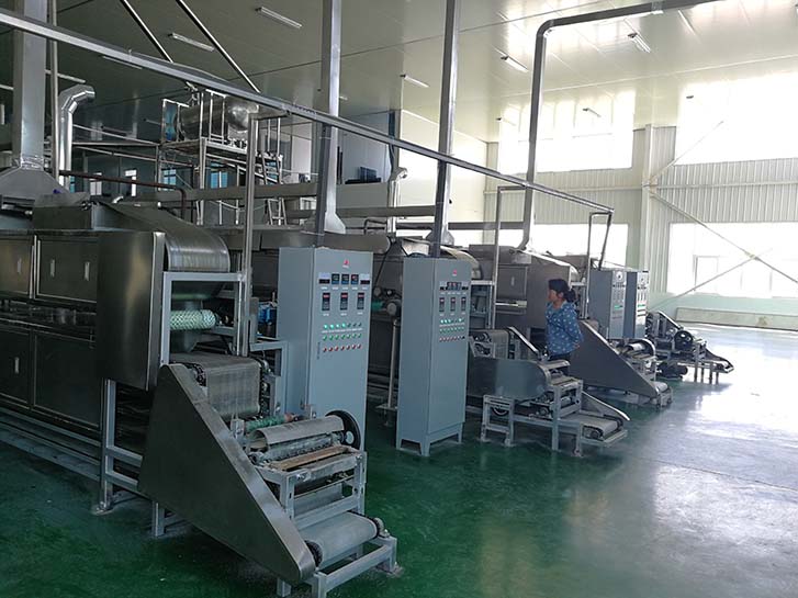 sthpzx粉皮生产线采用室内作业制粉理念,升级蒸汽换热系统,从淀粉和浆到定长横切出机自动化、流水线作业,原料只需薯类淀粉和食用水。