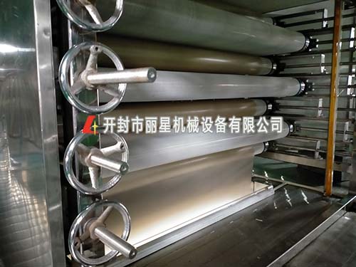 sthpzx红薯粉条生产线采用了感应铺浆蒸熟工艺,改变了以往燃煤加热,采用蒸汽蒸熟,然后进行冷却脱离,进行低温老化,设备本身自带了冷库,老化后直接进入冷库冷冻;涂布式的粉条加工设备配套了烘干装置,不需要室外晾晒,加工粉条定长横切,长短一致,粗细均匀,成品出机即可包装。