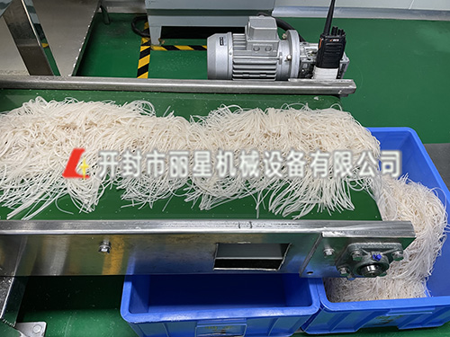 方便粉丝机设备的工艺流程为:螺旋搅拌→真空上料→恒温储料→感应铺浆→蒸汽蒸熟→冷却脱离→常温老化→低温老化→竖切丝→定长横切→称重装碗→自动压碗烘干→除潮出机